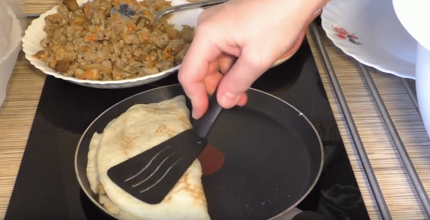 Когда увидим, что по краям тесто уже пропеклось, кладем на одну половину блина начинку из мяса с грибами.