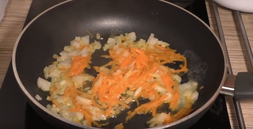 2. Сначала обжариваем на среднем огне мелко нарезанный лук вместе с морковью, натертой на крупной терке. Буквально 5 минут.