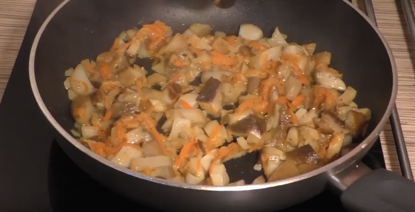 Фарш тщательно смешать с овощами, жарить на небольшом огне, часто помешивая, около 10 минут.