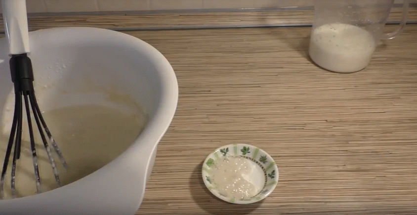 Слегка все взбейте, просейте муку, перемешайте до полного растворения комочков, тесто должно быть однородным.