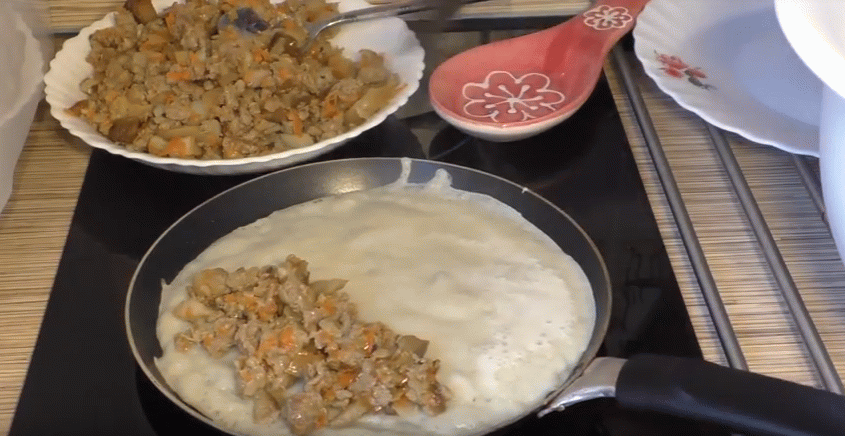 Еще один популярный вид начинки для блинов с фаршем — добавление к нему яиц. Многие ошибаются на этом месте и просто добавляют сырые яйца к обжариваемому фаршу.