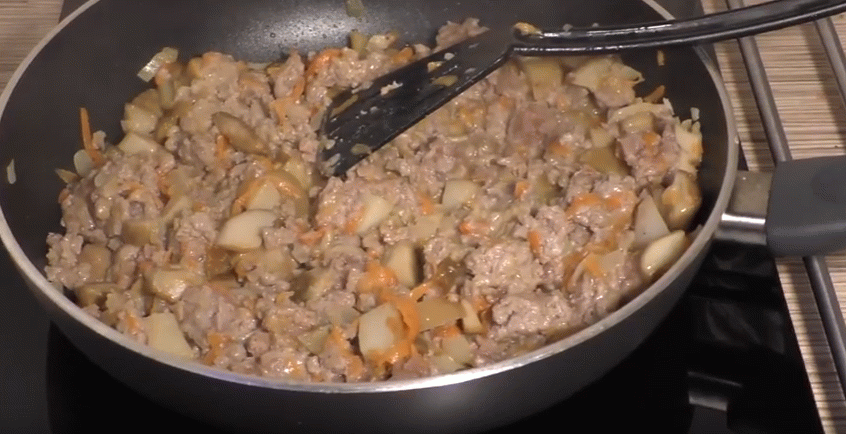 1. На растительном масле слегка обжариваем мелко нарезанный лук, к нему добавляем фарш. Фарш также следует нарезать мелко. Готовим на среднем огне минут 20. Солить и перчить по вкусу.
