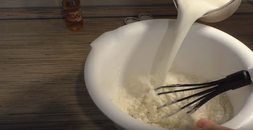 Соединить молоко и воду. В мучную смесь, постоянно перемешивая, постепенно влить смесь молока и воды.