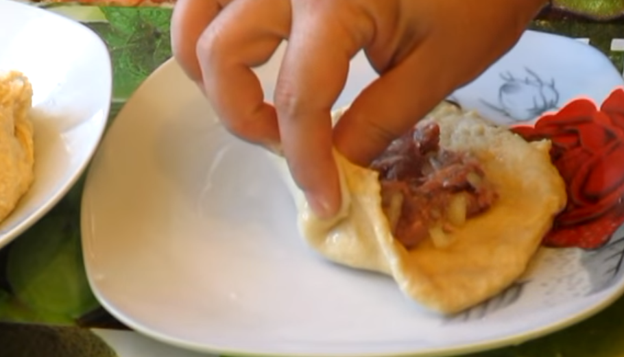 7. В середину лепешки кладем одну столовую ложку фарша и собираем беляш, защипывая края гармошкой.