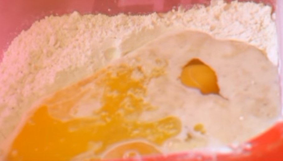- Тесто готовится следующим образом: в большую миску просеять муку. В образовавшемся холмике из муки сделать углубление. В него вбить яйца, добавить остальные ингредиенты. Быстро замесить тесто, его скатать в шар (оно должно отлипать от рук). Шар прикрыть, вынести на холод на полчаса.