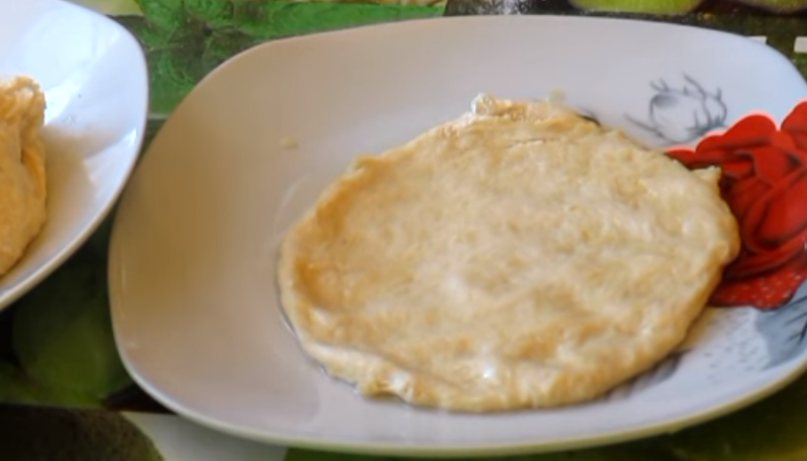6. Отщипываем от теста кусочек размером с яйцо или чуть больше и разминаем его в лепешку толщиной приблизительно в 1 сантиметр.