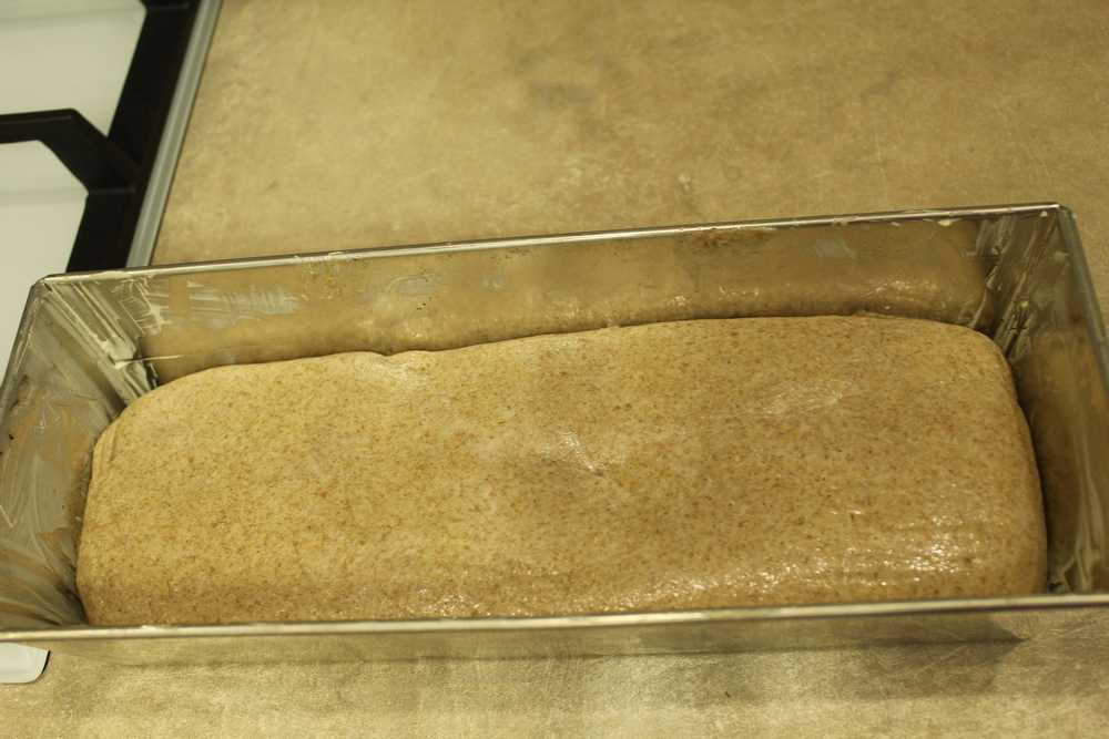 Тесто сформируйте руками или можете воспользоваться скребком. Сначала придайте заготовке прямоугольную форму, затем огладьте ее руками и только потом аккуратно перенесите в металлическую форму. Чтобы верх хлеба получился ровным, его нужно пригладить скребком или силиконовой лопаткой. Если тесто липнет к скребку, при необходимости его слегка сверху смачивайте водой.