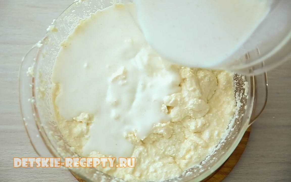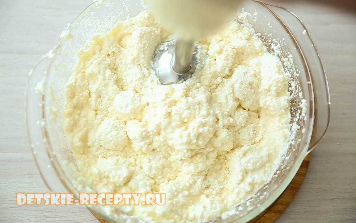 - Если в наличие обычный творог, то измельчите его в блендере или перетрите через сито, чтобы избавиться от комочков.