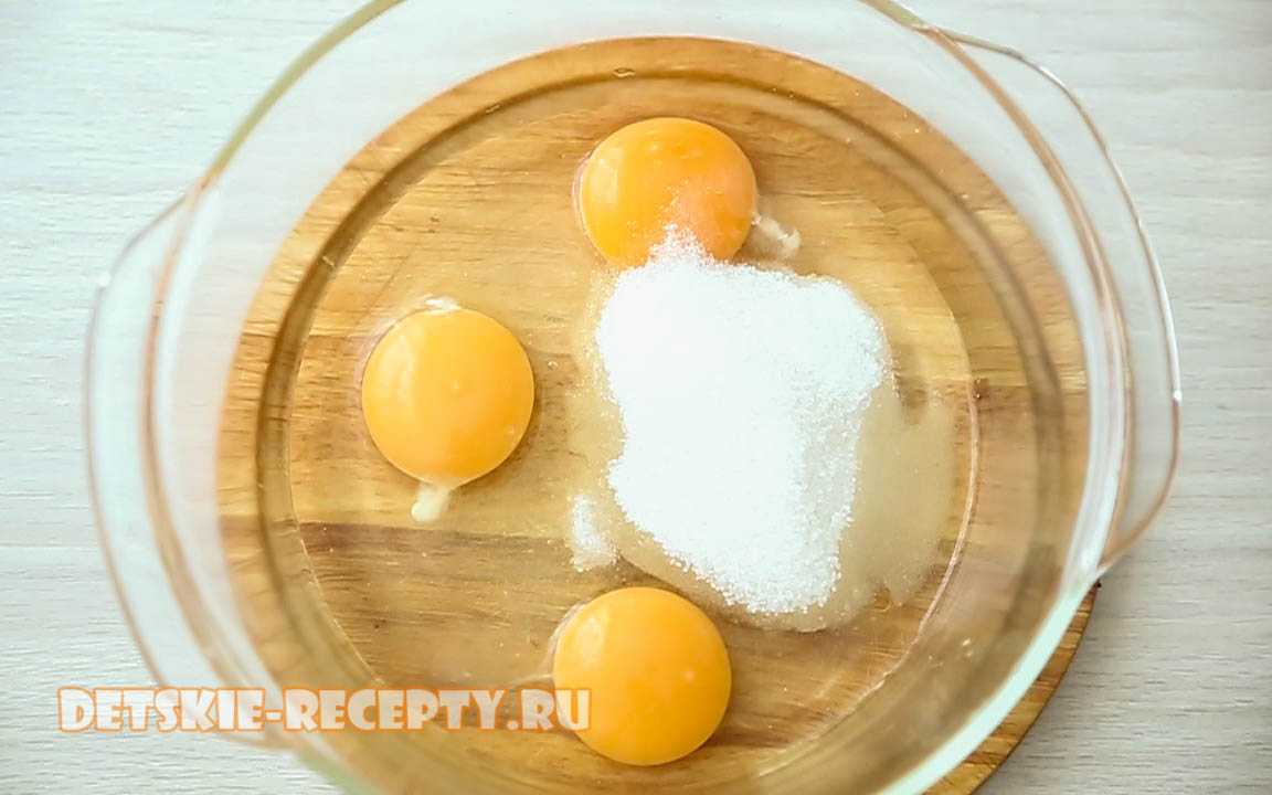 Итак, взяли яйца комнатной температуры, обмыли их, разбиваем в глубокую миску, где планируем замешивать тесто. Всыпали сахар и соль и сразу же замешали миксером или венчиком.