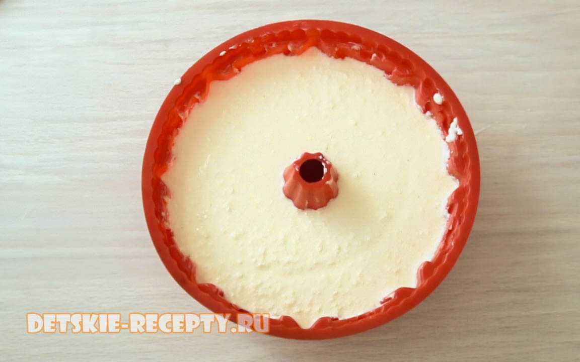 - Далее необходимо выложить получившуюся творожную массу в форму и разровнять (рекомендуется круглая емкость диаметром 22 см либо прямоугольная с размерами 18х25 см), поставить в духовку, прогретую до 160°С, и запекать примерно 25-30 мин.