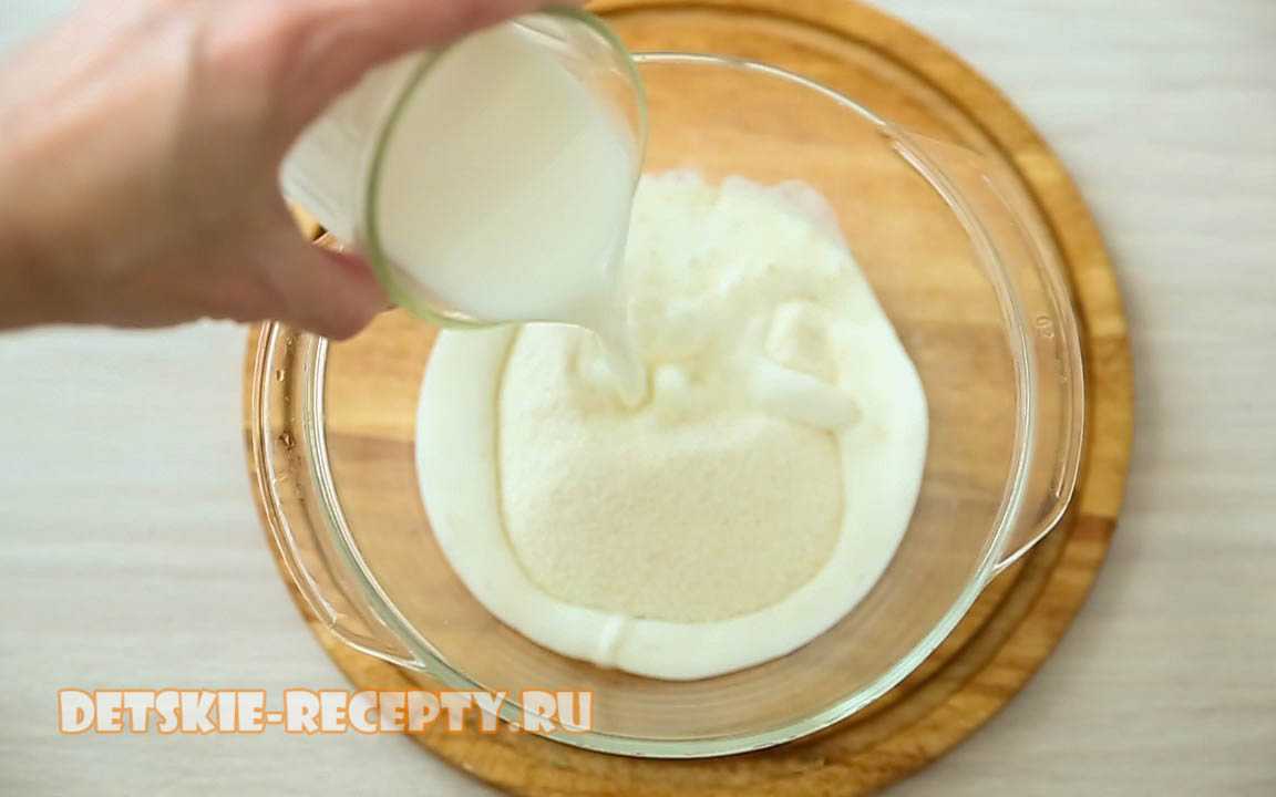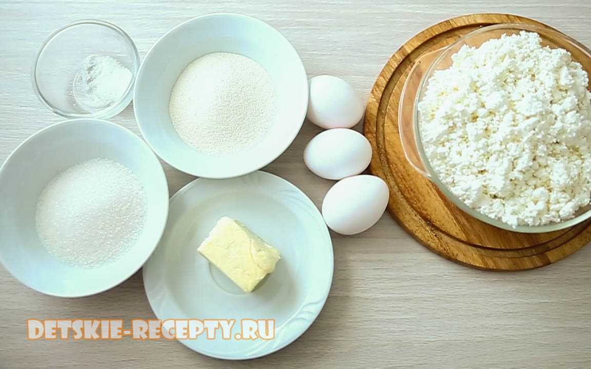 - В большую емкость требуется всыпать творог, 2 яйца, манную крупу, соль и сахар, влить молоко. Количество сахара можно уменьшить до 100 г, но, если творог имеет кислый вкус, лучше этого не делать.