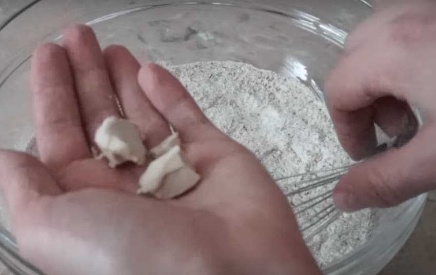 1. В просеянную муку добавьте соль. Руками аккуратно перетрите живые дрожжи и всыпьте их в смесь.