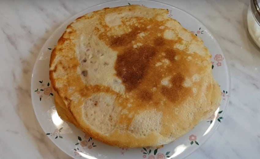 В этом рецепте сода также не используется. Её место занимают дрожжи, благодаря которым блины получаются пористыми, пышными, почти как сдобная выпечка.