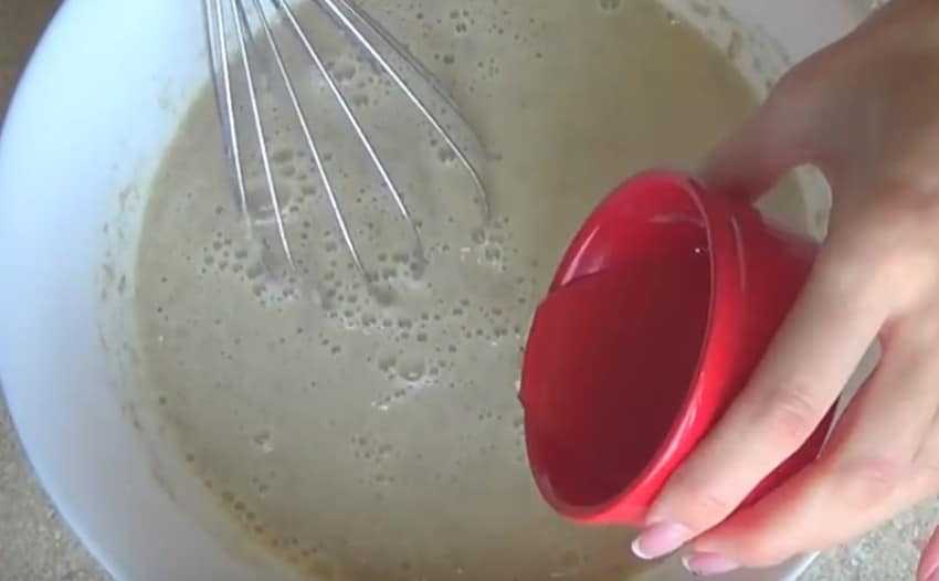 - Соединить кипяток с содой и влить эту смесь в тесто.
