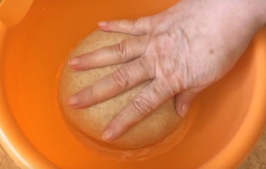 Этому тесто достаточно одной обминки через час после начала брожения. Для этого просто растяните тесто в одной стороны и накройте им противоположную сторону. И так повторите со всех-4х сторон.