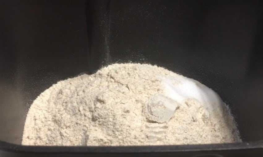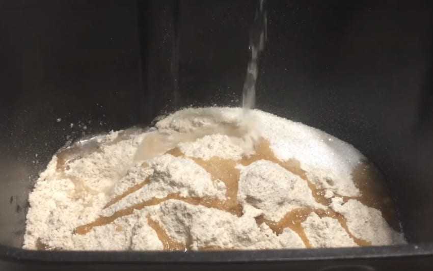 1. В чашу хлебопечки с установленной лопаткой для размешивания высыпьте дрожжи. Затем засыпьте все остальные сыпучие ингредиенты.