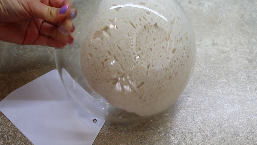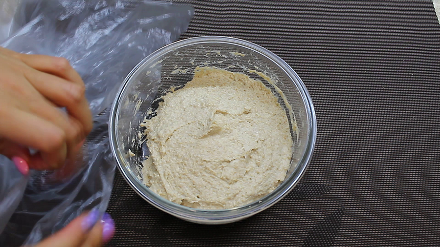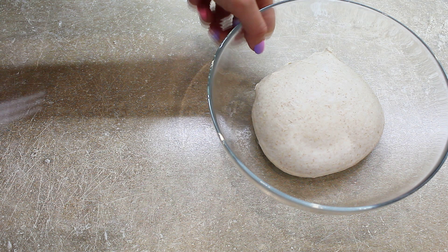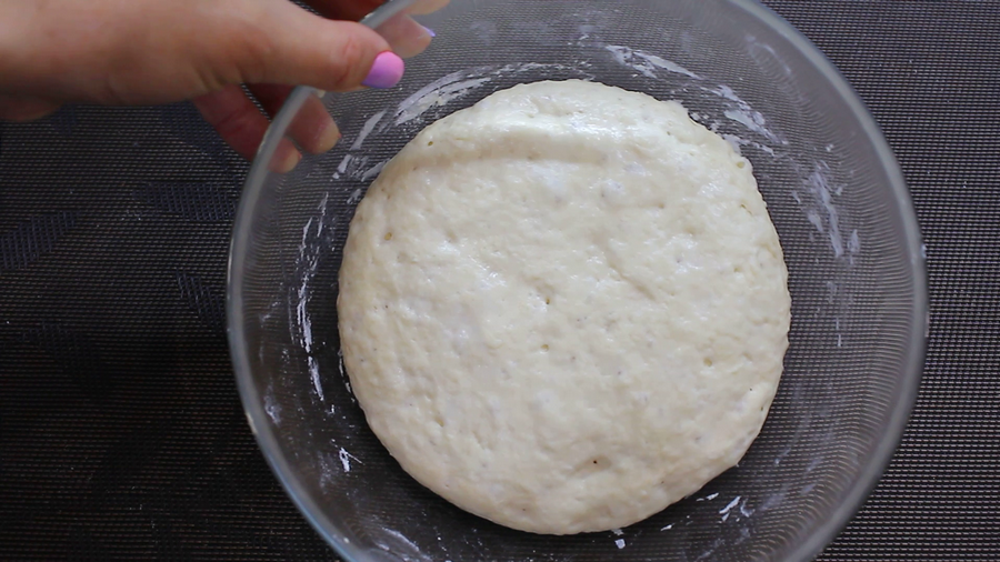 После замеса переложите тесто в миску и сверху накройте пленкой. Оставьте тесто на брожение на 2,5 часа при температуре 24°С.
