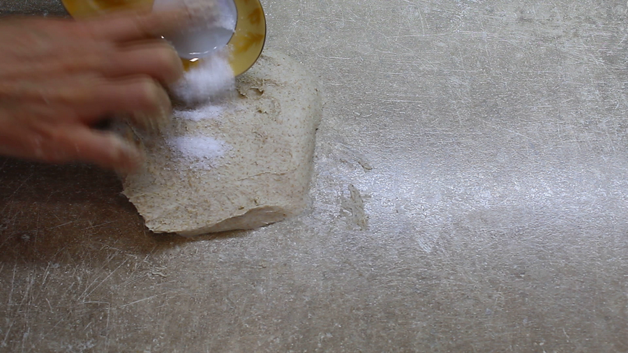Когда тесто станет гладким и эластичным, добавьте соль. Вымешивайте до тех пор, пока соль не перестанет чувствоваться под пальцами. Мне для этого понадобилось около 3 минут.