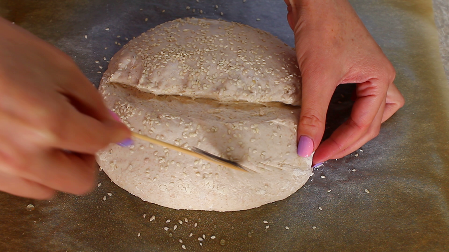 Когда тесто настоится, еще раз выкладываем его на кухонный стол и вручную обминаем несколько раз. Руками придаем тесту округлой формы, делаем на поверхности изделия ножом несколько надрезов и выкладываем на застеленный бумагой для выпечки противень.