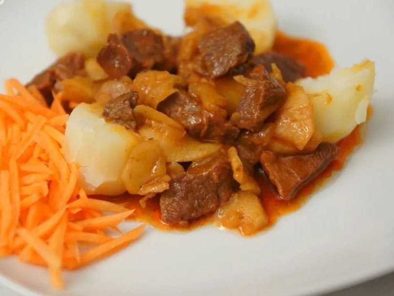 Обжаренное мясо с выделившимся соком поместить в кастрюлю, залить горячей водой (250 мл) и тушить под крышкой на слабом огне 50-60 минут. При необходимости во время тушения выкипающую жидкость дополнить горячей водой.
