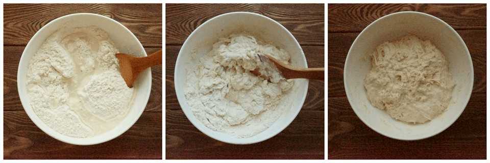 Закваска по внешнему виду напоминает жидкое тесто для блинов. Для её приготовления мы растворяем сухие дрожжи в нагретой до 40 градусов воде (в качестве альтернативы можно взять 6 г свежих дрожжей). Муку просеиваем в миску. Всё объединяем, наливая жидкость в муку.