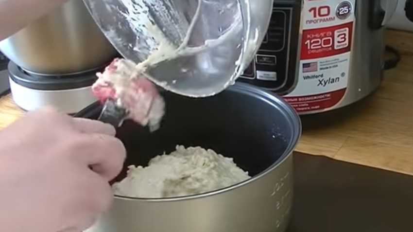 4. Дно и стенки чаши мультиварки смажьте тонким слоем масла и переложите в нее тесто. Выберите режим «Выпечка», время 1 час.