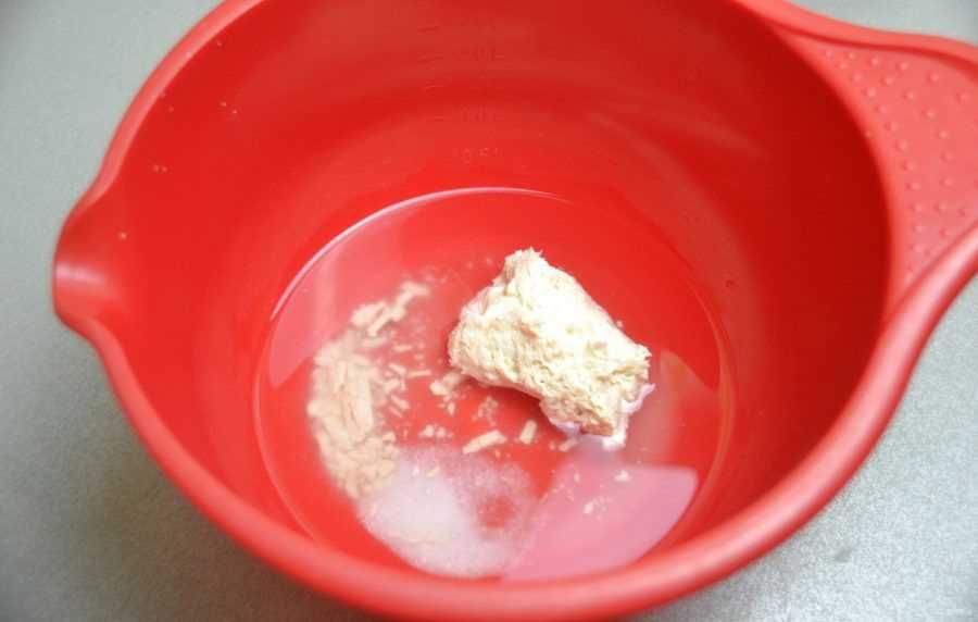 Вначале замесим опару. Как обычно, покрошим дрожжи в миску и разотрём их с сахаром.
