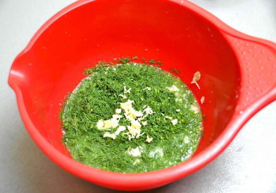 Из зубчиков чеснока делаем кашицу, натирая его на малой мелкой терке, при помощи чеснокодавилки и ножом. Пучок свежего укропа тоже нарезаем мелко.