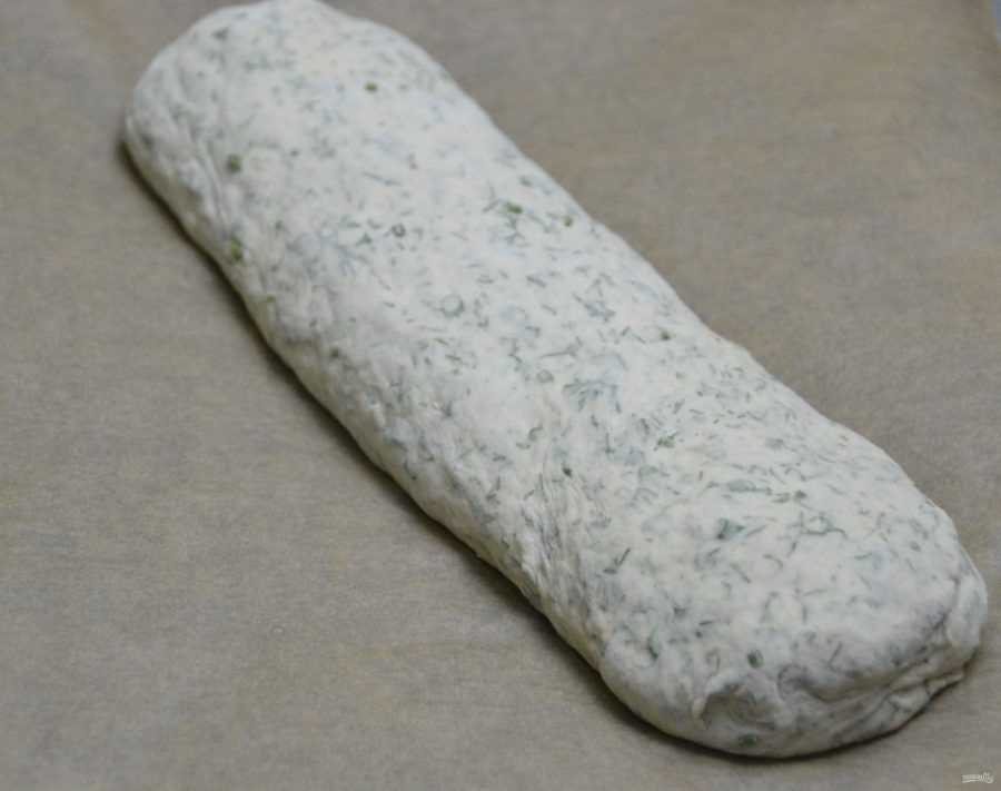 Заверните тесто в рулон, хорошо скрепите край теста, подкатайте в «батончик». Переложите на лист для выпечки и дайте расстойку 1 час.
