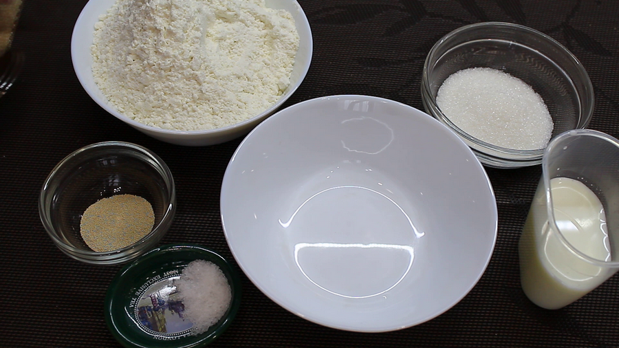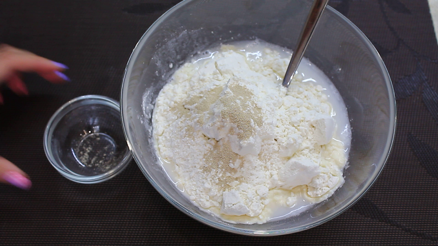 Затем добавьте 0,5 г сухих быстродействующих дрожжей и все перемешайте. Теперь добавьте 4,8 г сахара и 0,9 г соли. Снова все перемешайте до однородности.
