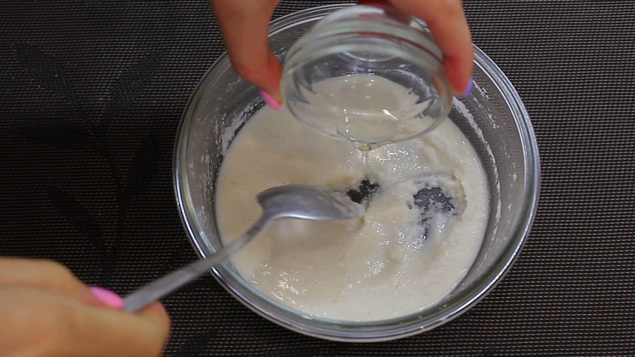 Осталось добавить 2,4 г растительного масла. В итоге получилась глазурь средней консистенции. После этого накройте ее крышкой или пленкой и оставьте до момента окончания расстойки хлеба. Но не больше, чем на 1,5 часа.