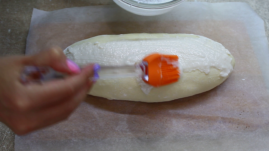 Теперь я переворачиваю заготовку на пергаментный лист и сверху всю заготовку обильно смазываю подготовленной глазурью.