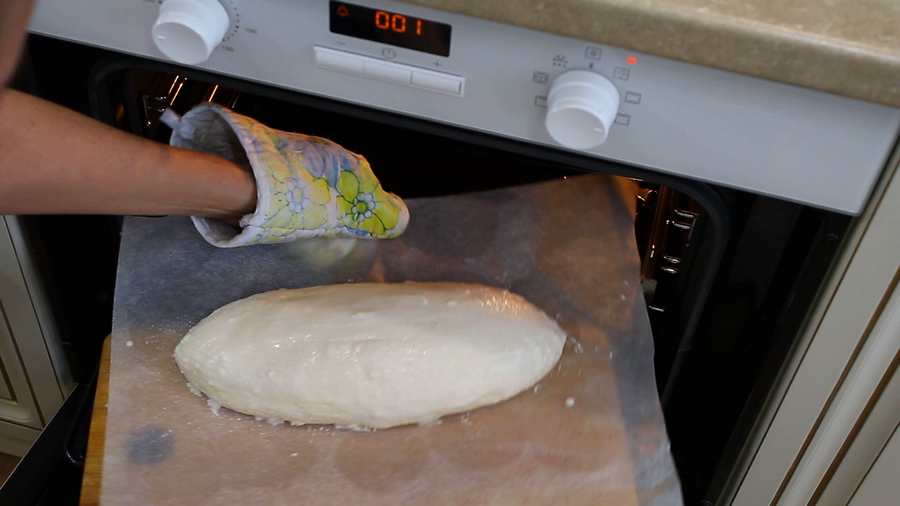 После формовки я перекладываю хлебную заготовку швом вниз на хлопковую ткань, которую я заранее посыпала пшеничной мукой. Чтобы заготовка не заветрилась во время расстойки, я ее сверху накрываю пленкой. Оставляю на расстойке на 1,5 часа при температуре +24°С.