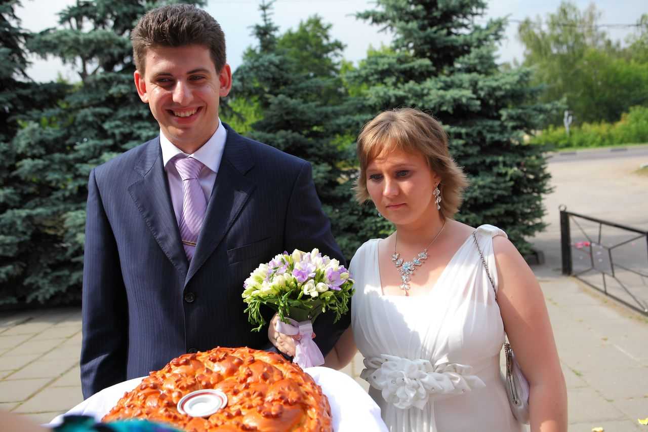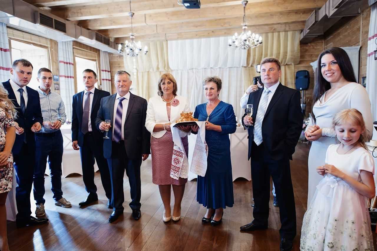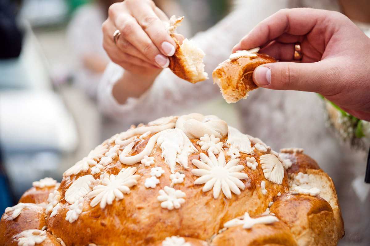 Встречая молодых с караваем, родители просят молодоженов оторвать без рук по куску каравая. Кто отломит большой кусок, тот и будет хозяином в доме. Ранее по традиции жены старались оторвать меньший кусок. Связано это с тем, что муж приводил в родительский дом жену, там же он был и добытчиком. Поэтому жене было негоже откусывать большой кусок.