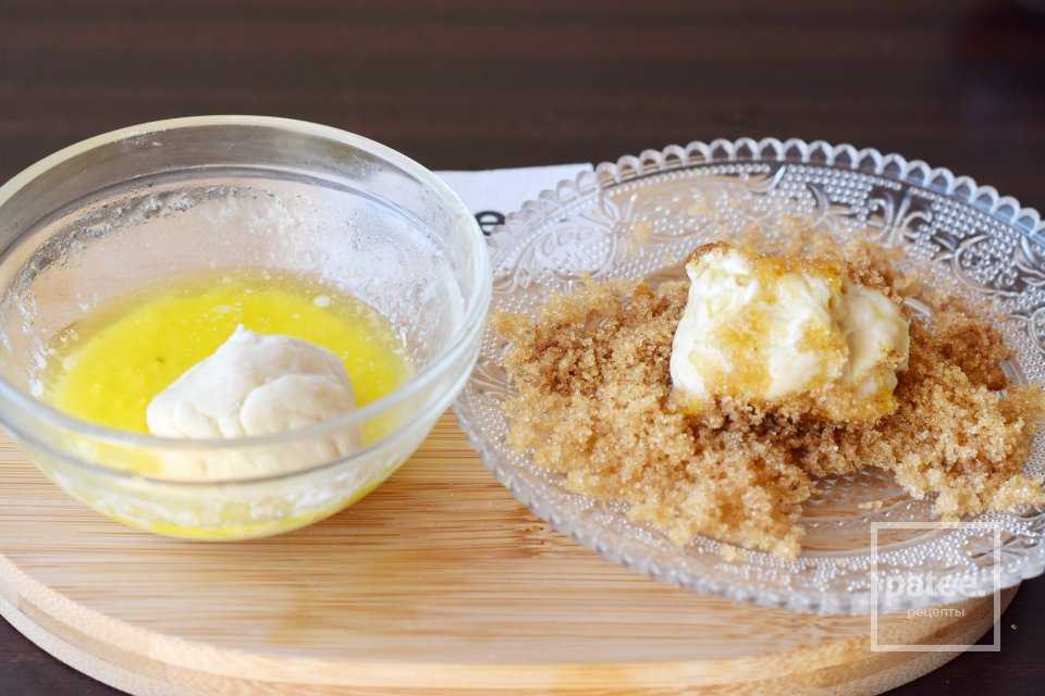 Заворачиваем начинку в тесто, формуем шарик.Макаем шарик в сливочное масло и обваливаем в коричном сахаре.