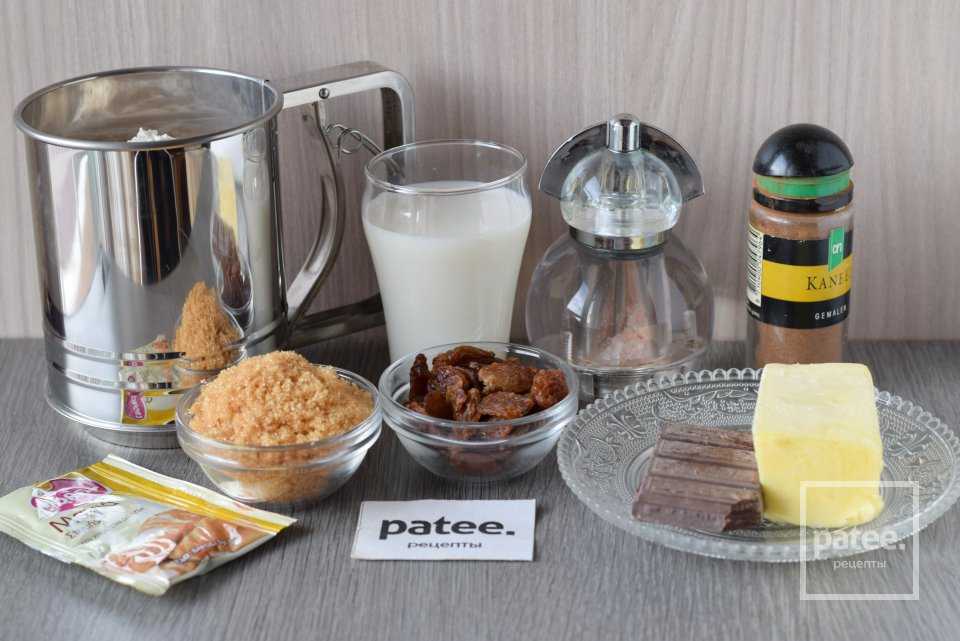 Для приготовления пирога нам понадобятся такие продукты: сливочное масло, коричневый сахар, мука, сухие дрожжи, молоко, шоколад, изюм, корица.