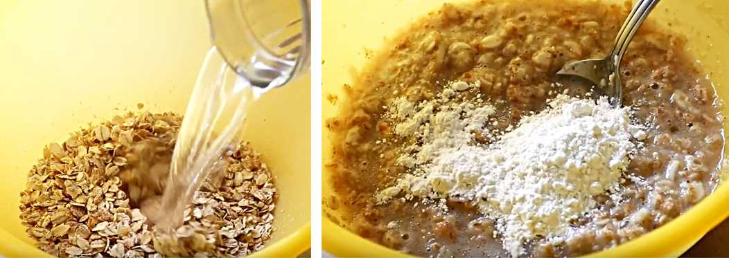 Всыпаем в овсяное тесто муку и еще раз перемешиваем.