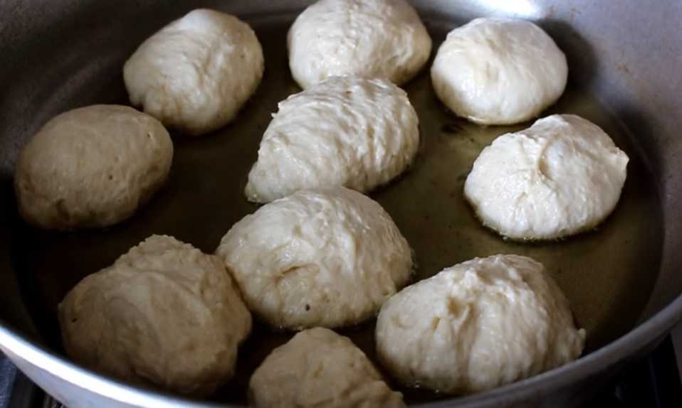 Сковородку ищем с толстым дном, разогреваем в ней пару ложек растительного масла и начинаем жарить пышки.