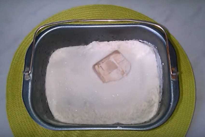 4. Сверху ложкой делаем углубление и всыпаем дрожжи. Ставим форму в хлебопечь. Выбираем режим «Сладкий хлеб», вес — 900 гр. и устанавливаем «Средний цвет корочки». Программа длится 2.5 часа.