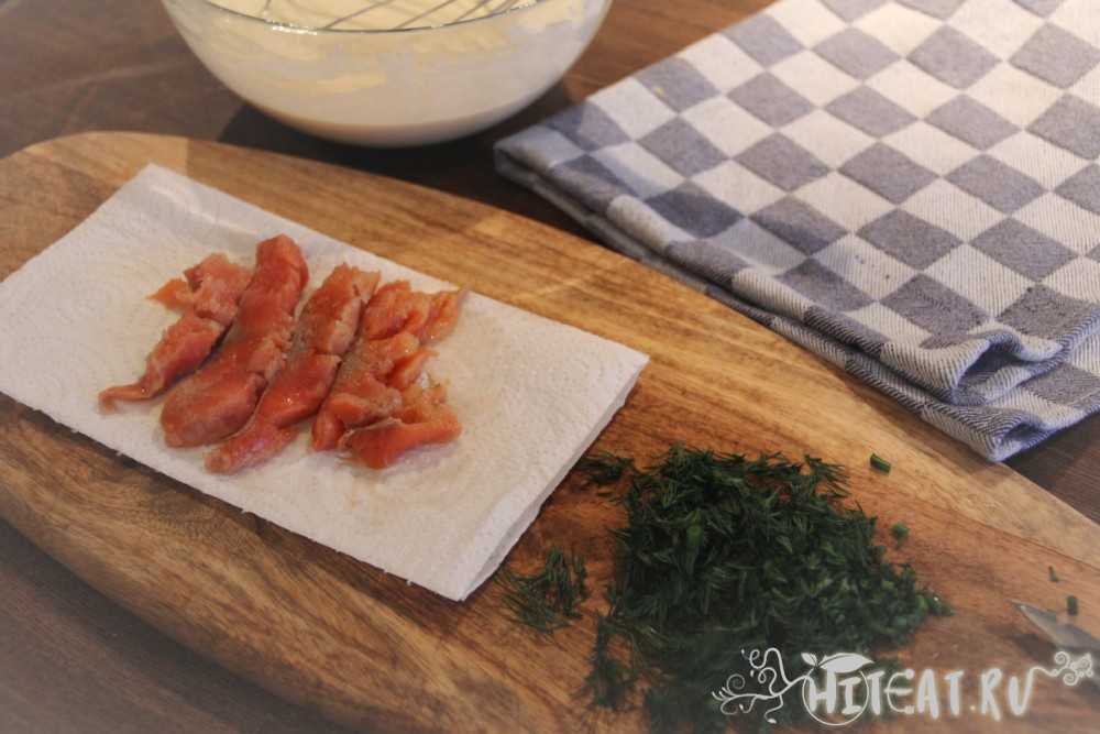 - 150 граммов филе соленой красной рыбы (семги или форели);