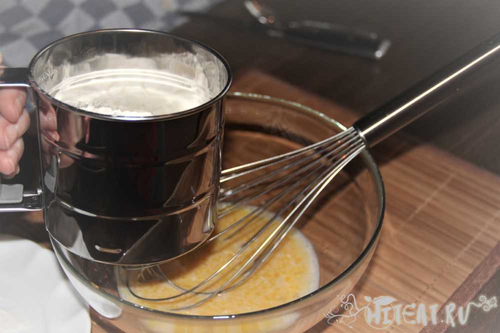 - Добавляем в ячную болтушку частями, чтобы не загустить тесто сильнее, чем надо. Пусто оно получится жидковатым. Лучше попробовать испечь один блин и потом принять решение о добавлении муки. Потому что если вы тесто будет густым, то блины будут толстыми и при сворачивании они поломаются, а может и вообще не свернутся.