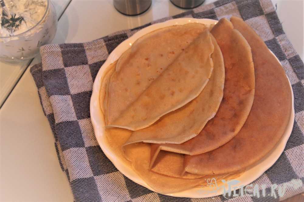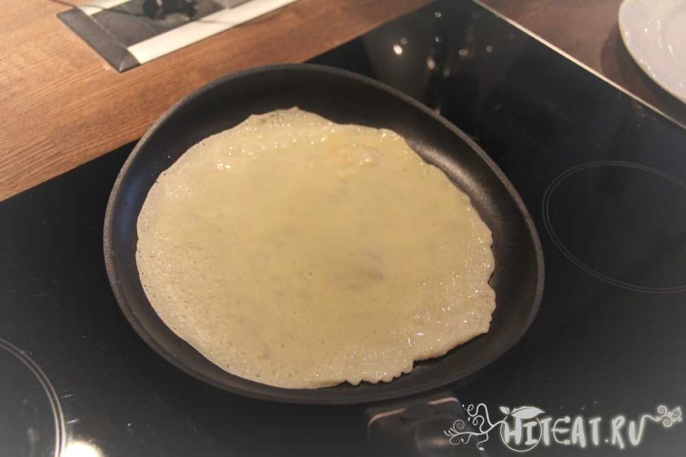 В целом, блины можно печь не только на воде. Но структура блинов, приготовленных на молочных продуктах, особенно кефире, более плотная. Для такой начинки она идеально подходит. А чтобы тесто не было слишком тяжелым, в него нужно всегда добавлять пару грамм соды или разрыхлителя. Если нет ни того, ни другого, можно воспользоваться сильно газированной минералкой.