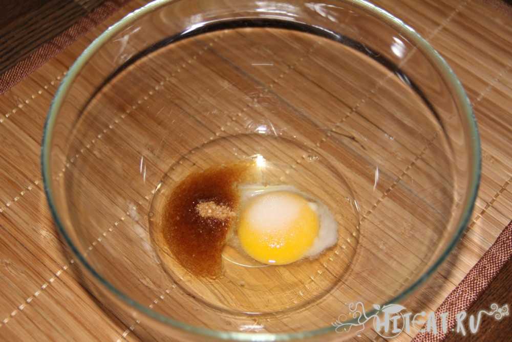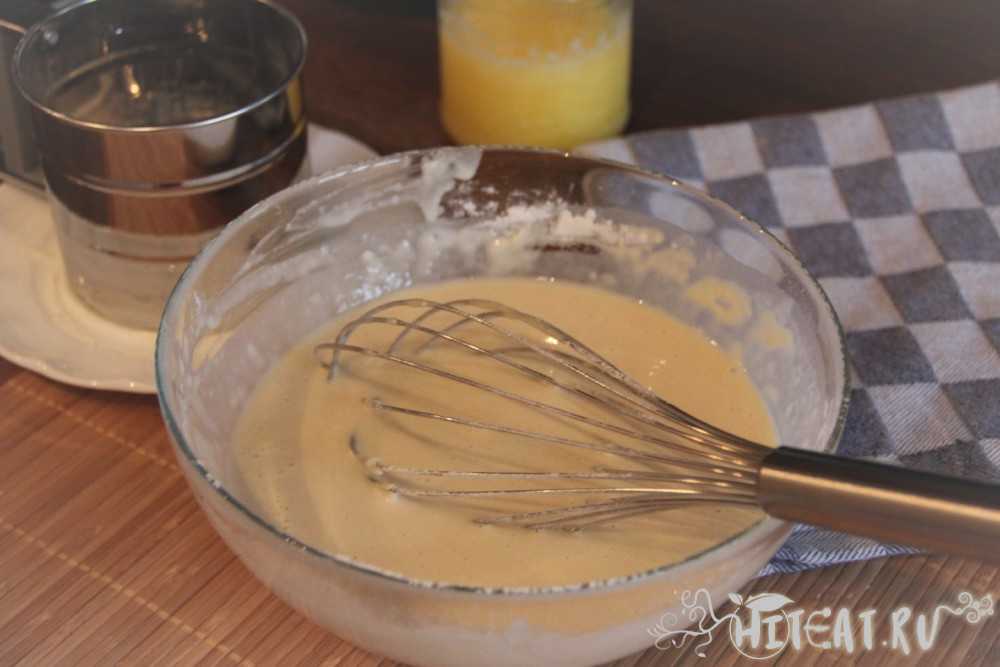 - Добавляем к желткам сметану, соль и сахар. Растираем яичную массу с помощью вилки или миксера, постепенно добавляя молоко и растопленное сливочное масло.