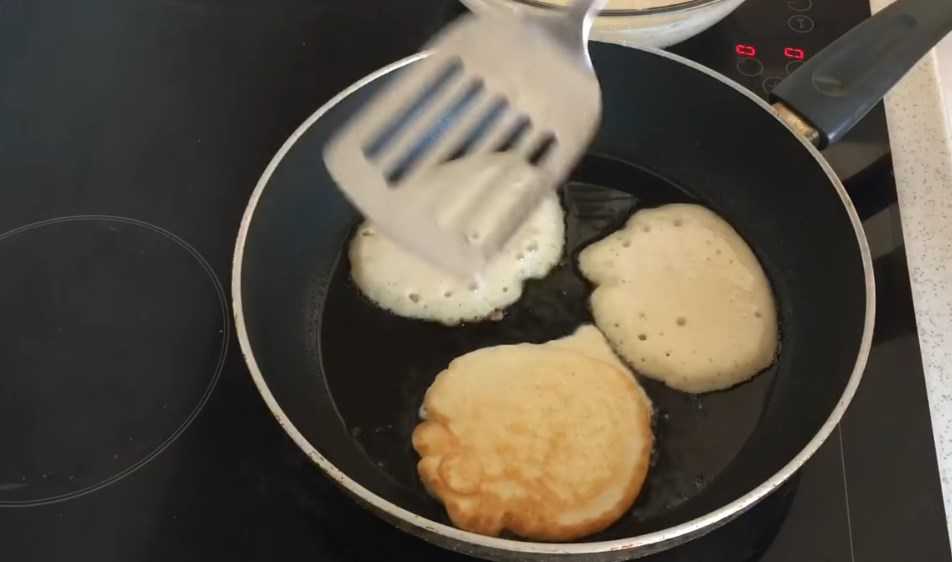 - Когда тесто схватится и сверху появятся пузырьки, переверните оладьи и жарьте с другой стороны.
