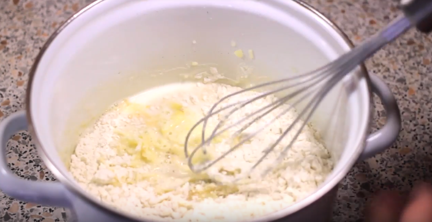 - Кислое молоко слегка подогрейте в микроволновке или на водяной бане. Влейте молоко в миску к яичной массе и слегка перемешайте.