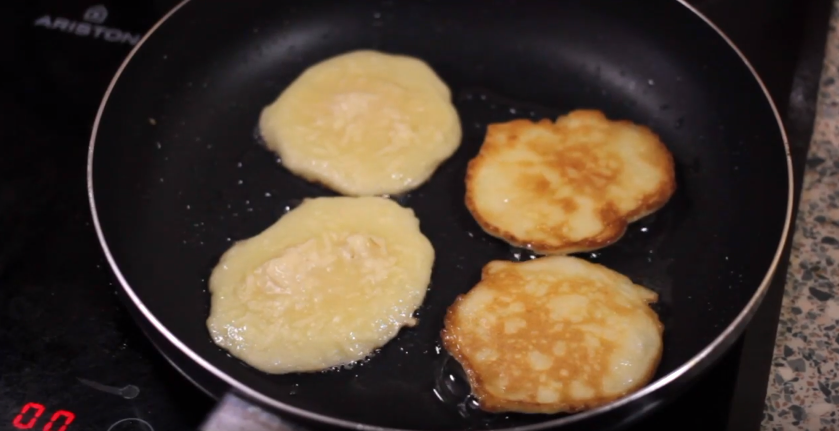 - Жарьте оладьи на среднем огне с двух сторон. Затем промокните их от жира бумажными полотенцами и подавайте на стол.