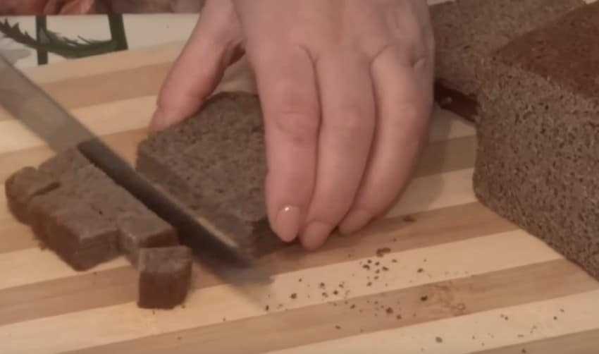 Оставшийся кусок вчерашнего хлеба нужно сразу порезать ломтиками, кубиками, длинными брусочками: хлеб, высохший полностью, резать значительно сложнее.