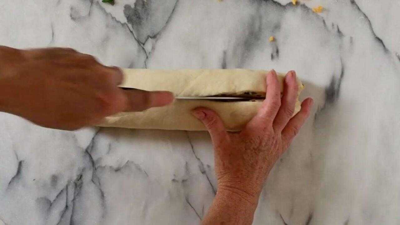 12. Притрушиваю сухими травками. Нарезаю тесто небольшими прямоугольниками.