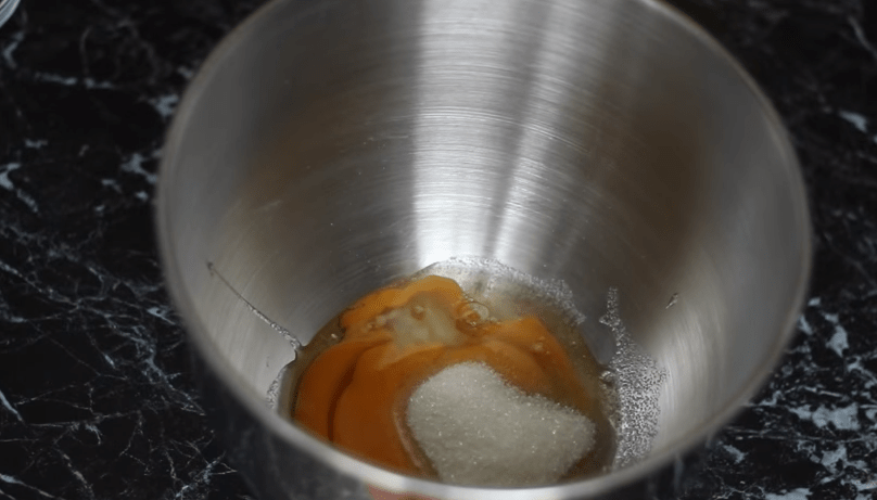 - В посуду для замешивания выливают яйца предпочтительно комнатной температуры, их посыпают и тщательно перемешивают с солью и сахаром.