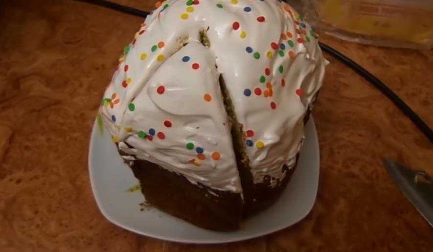 - За 25 мин. до завершения программы смазываем верхушку кулича глазурью, чтобы она успела подсохнуть. Для приготовления глазури нужно взбить белок 1 яйца с сахарной пудрой.